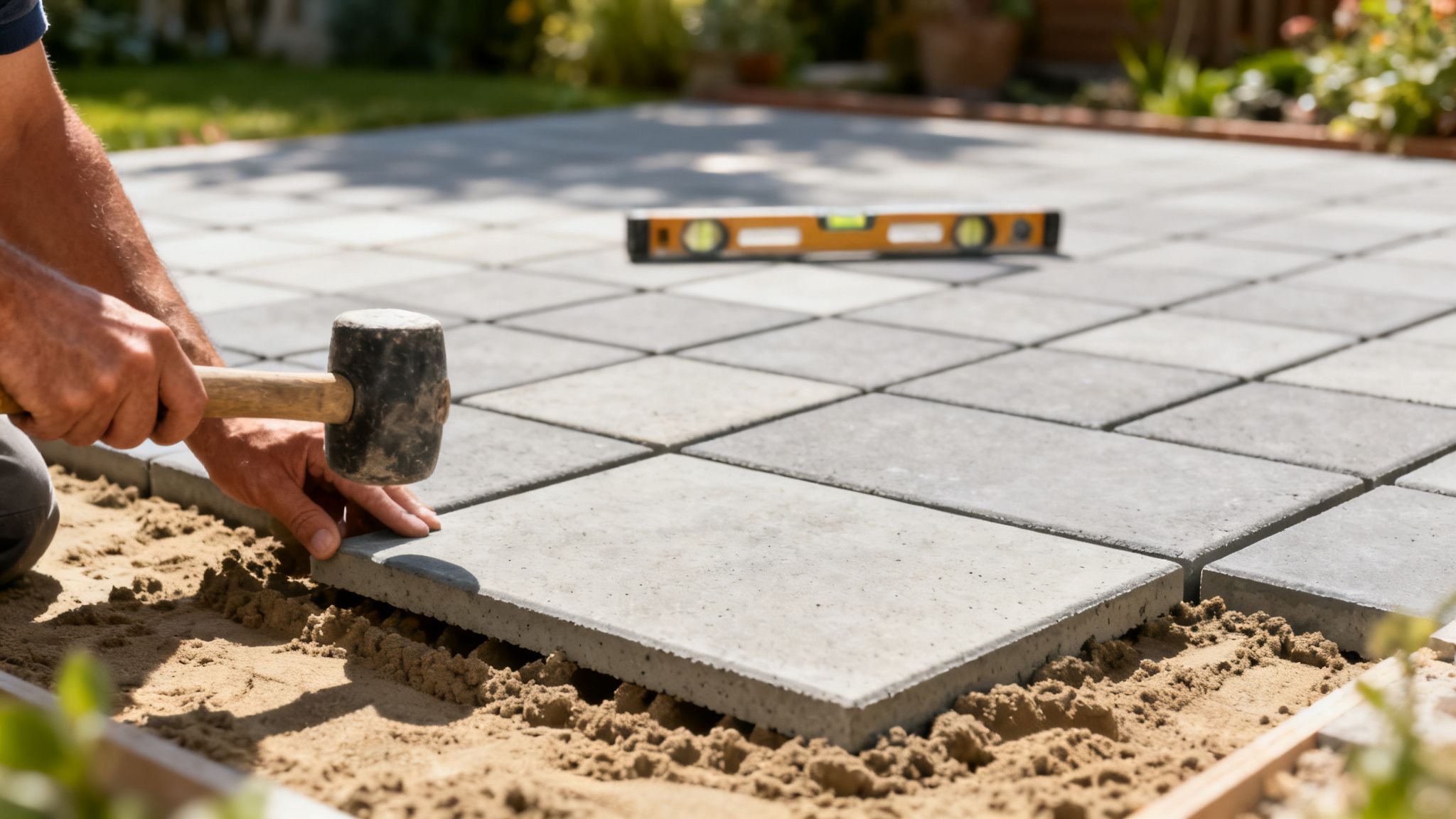 Med snoren på plads kan du forsigtigt lægge den første flise i afretningssandet. Brug en gummihammer til at give den et par lette dask, så den sætter sig stabilt og flugter med snoren. Kunsten er at bruge små, kontrollerede slag – du skal ikke banke den ned, men blot justere den på plads.