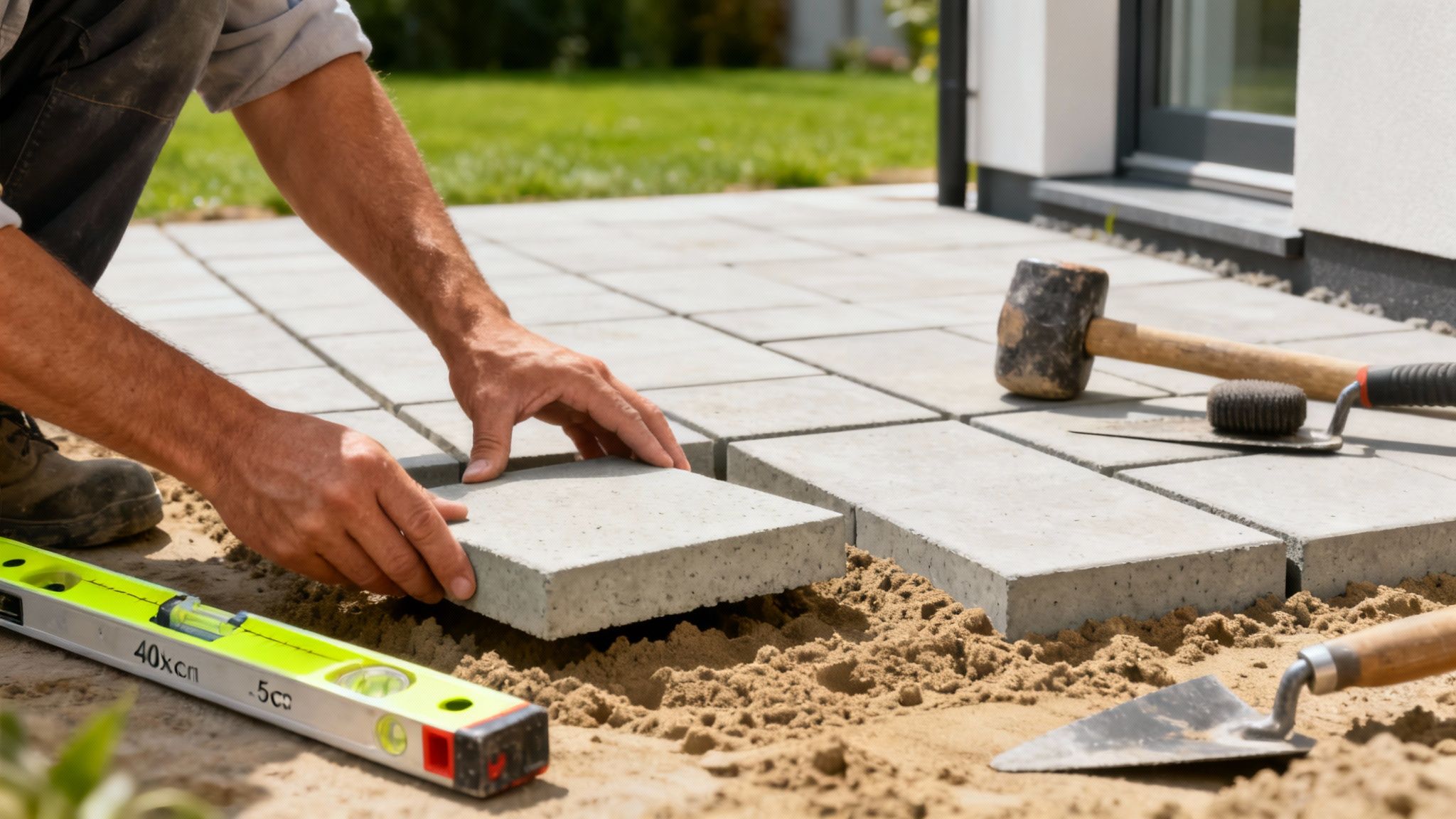 Dette lag kaldes afretningslaget. Det er typisk et 3-5 cm tykt lag af brolæggergrus eller specifikt afretningssand. Formålet er enkelt: at skabe en snorlige og helt jævn overflade, der samtidig bibeholder det korrekte fald, som du allerede har etableret i stabilgruset. Her tæller hver eneste millimeter, for den mindste ujævnhed vil du både kunne se og mærke senere hen.
