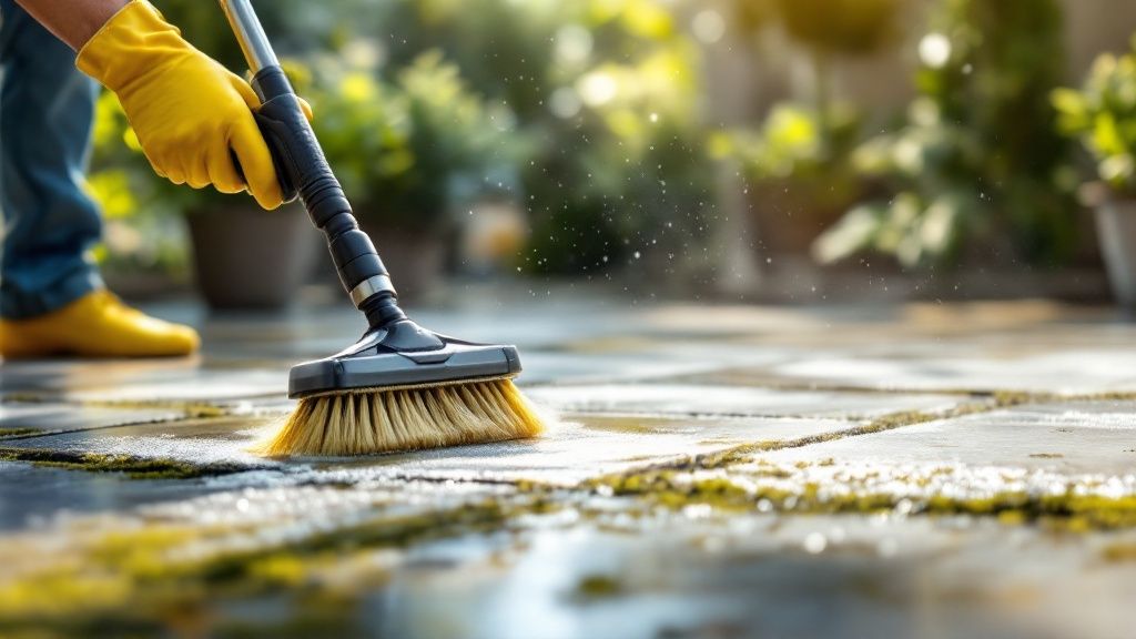 Ved at få styr på disse detaljer først, lægger du et solidt fundament for selve rensningen. Er du usikker på, hvordan du bedst håndterer en skadet belægning, kan du finde mere hjælp i vores guide til anlæggelse af en ny fliseterrasse. Dette forarbejde er din garanti for, at resultatet ikke bare bliver rent, men også stabilt og holdbart i mange år fremover.
