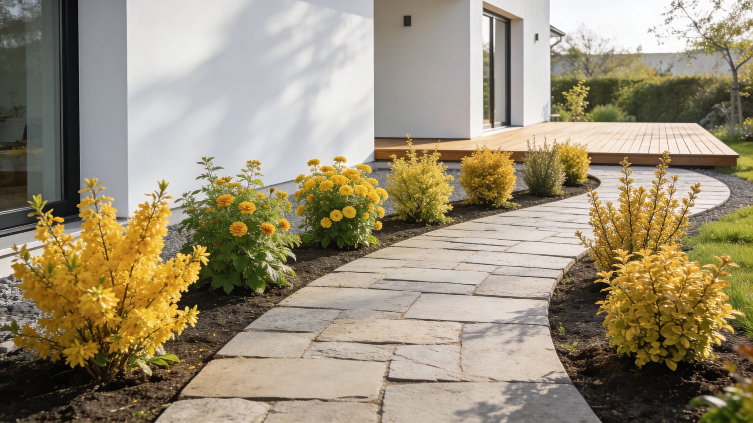 Buske med gule blomster er et stærkt greb, hvis du vil skabe varme omkring sten, grus, trapper og mure. Den gule farve lyser op mod både mørke fuger, lyse fliser og rå jordflader. Samtidig kan de rette buske samle overgangen mellem hus og have, så det hele virker mere gennemført.