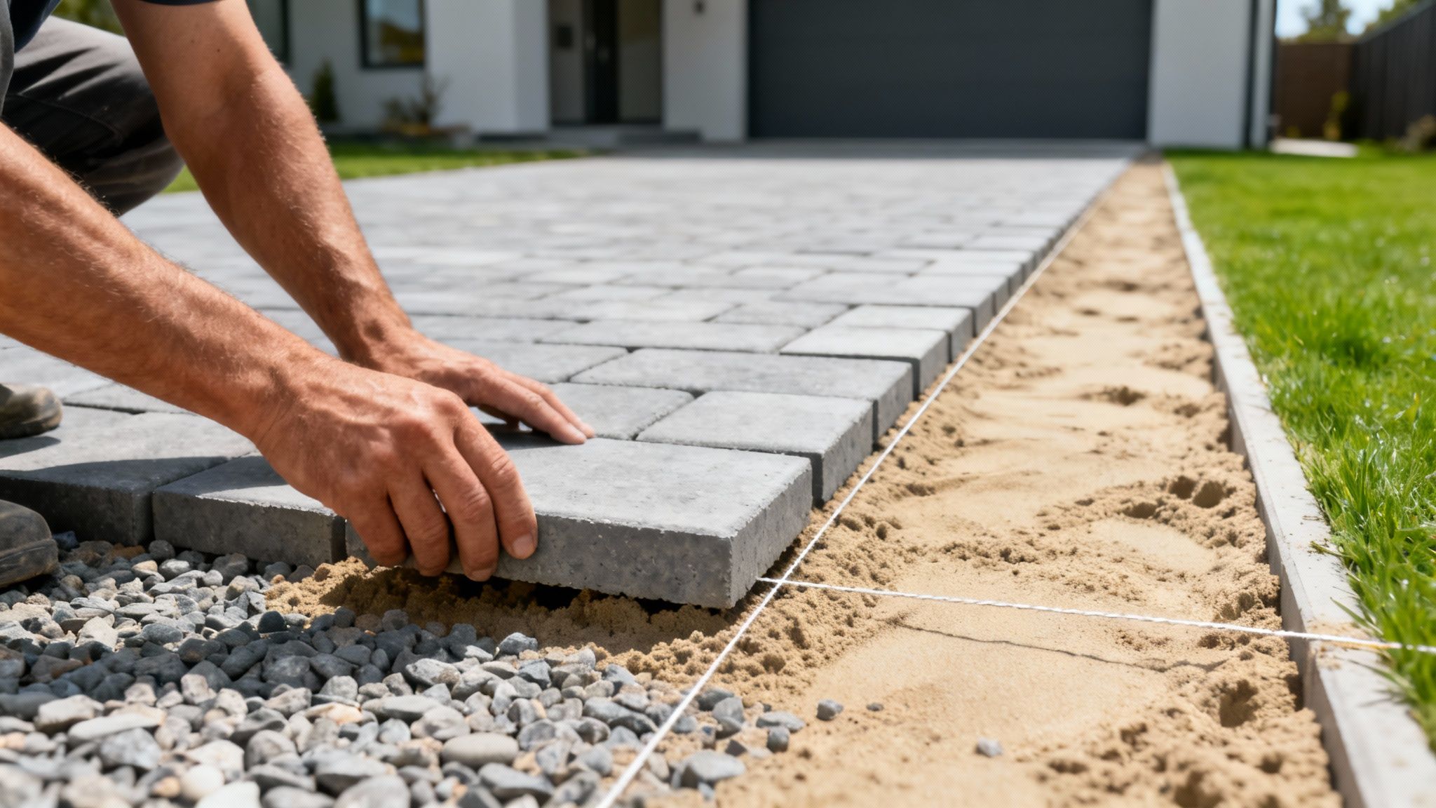 En brolægger lægger fliser i en indkørsel