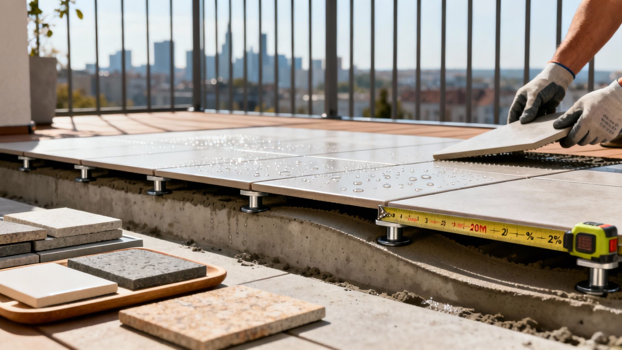 Detaljeret billede af opklodsning af fliser på altan med synligt fald og dræn.