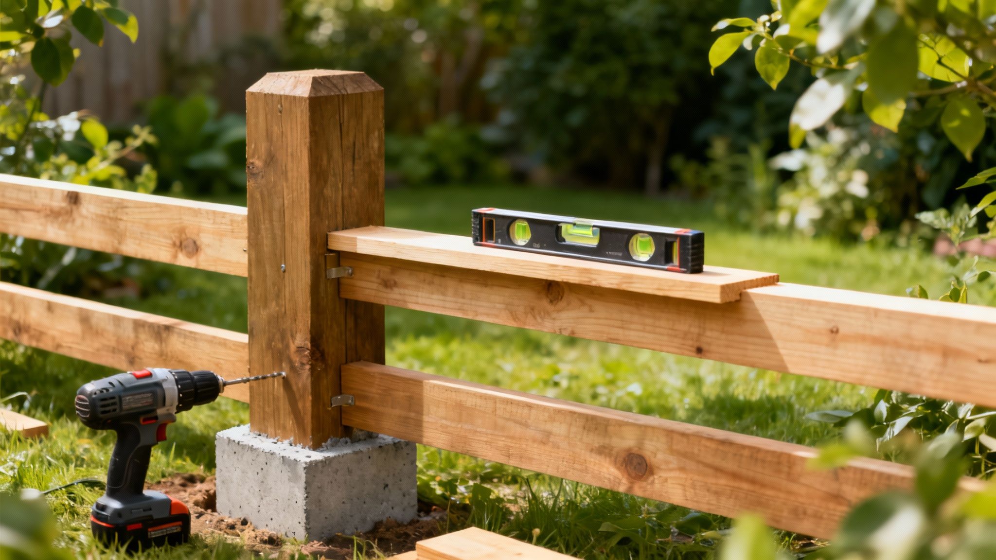 Sørg for, at dette bræt er i perfekt vater, før du skruer det fast. Det er din grundsten for hele hegnet. Med det på plads bliver resten af arbejdet pludselig meget nemmere.