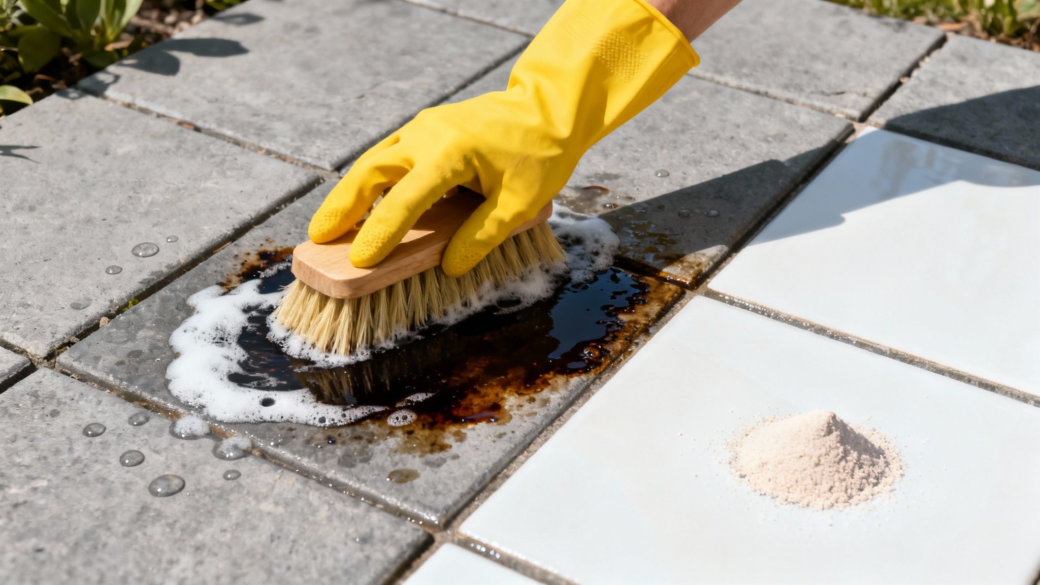 Efter en god omgang med børsten vil du se en fedtet, grumset blanding af rengøringsmiddel, olie og snavs oven på fliserne. Nu kommer et kritisk punkt: Alt dette skal skylles helt væk. Lader du det tørre ind, risikerer du bare, at olien sætter sig igen og efterlader en ny plet eller en grim, fedtet hinde.