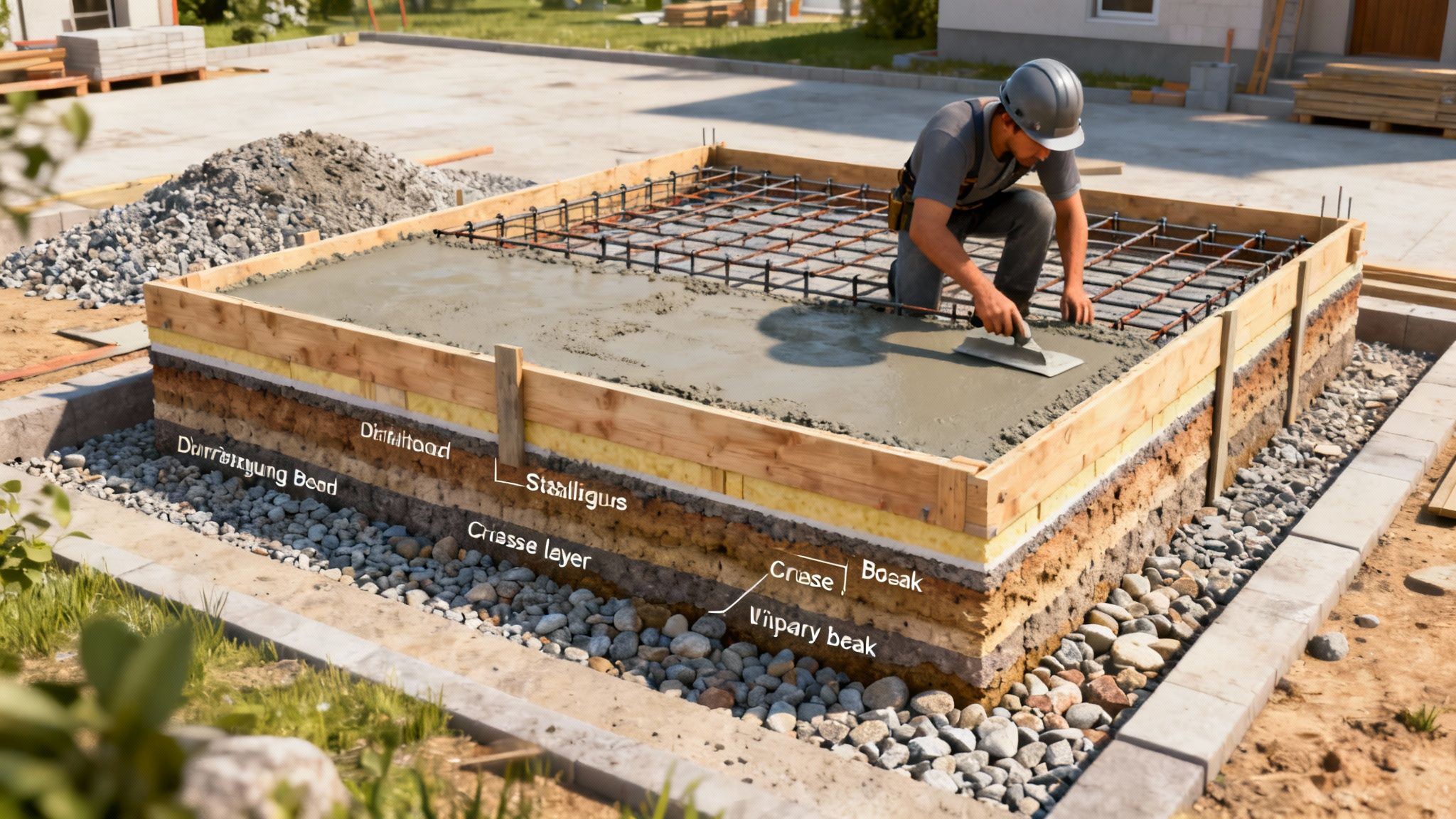 Det allerførste, vi lægger på den faste og plane jordbund, er et drænlag. Dets opgave er simpel, men kritisk: at lede vand væk fra konstruktionen, så det ikke står og presser på fundamentet og i værste fald trænger op.