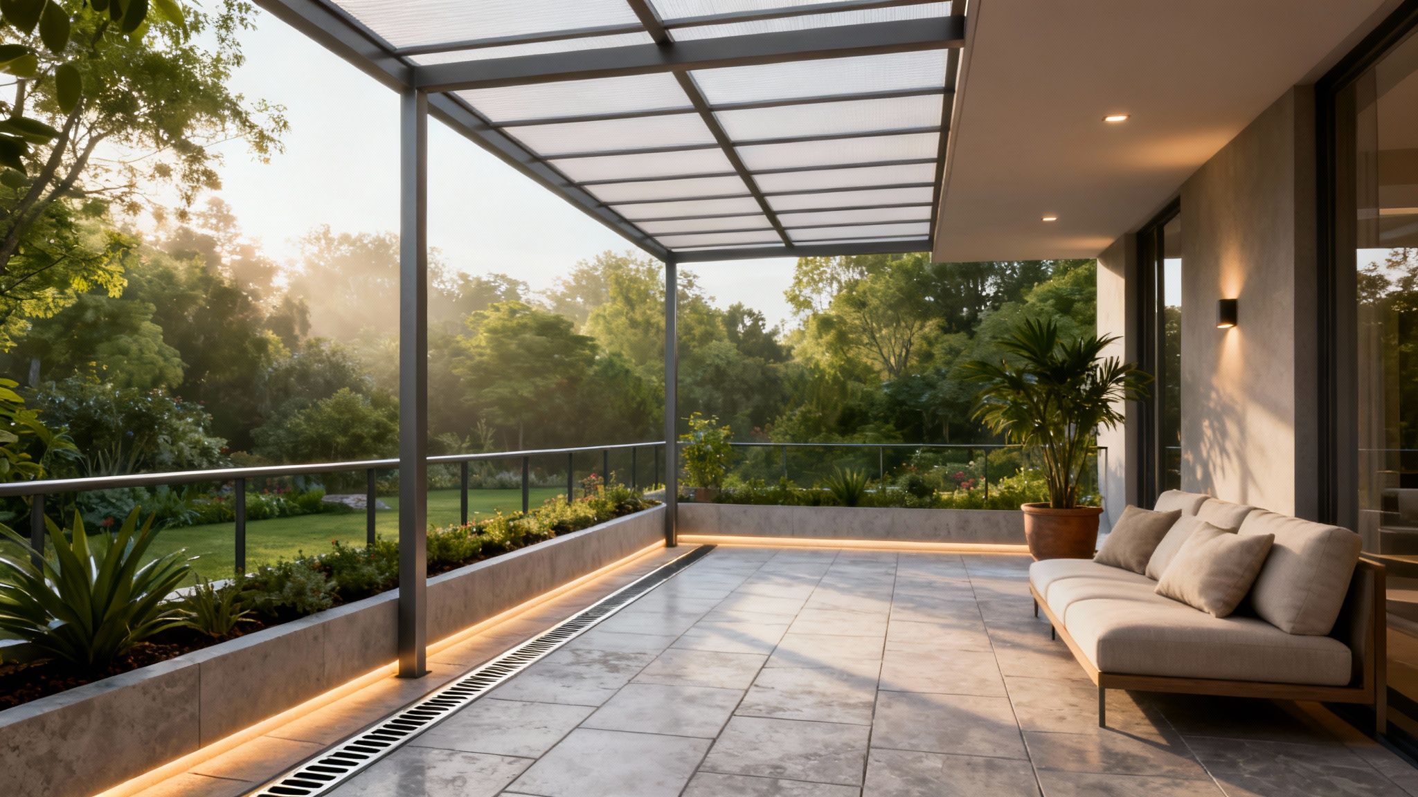 | Polycarbonate Skærm Overdækket Terrasse | Lav–moderat (kræver korrekt montage) | Polycarbonatplader og let ramme; lavt vedligehold | Maksimalt naturligt lys, UV- og vejrbeskyttelse | Private terrasser og villaer hvor lys prioriteres | Højt lysindfald, holdbar, lavt vedligehold |