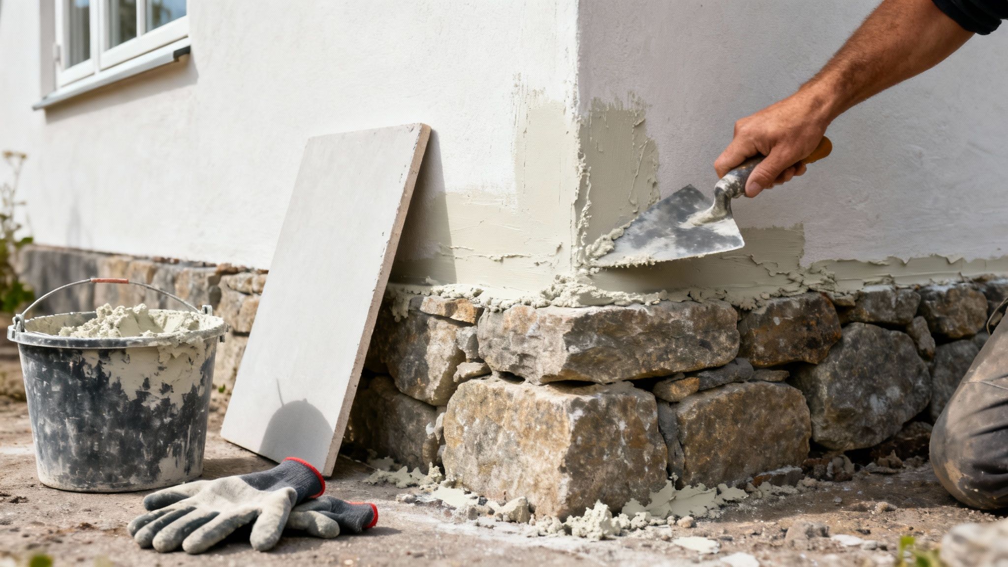En murer i gang med at påføre mørtel på en hussokkel med et pudsebræt, hvilket viser teknikken.